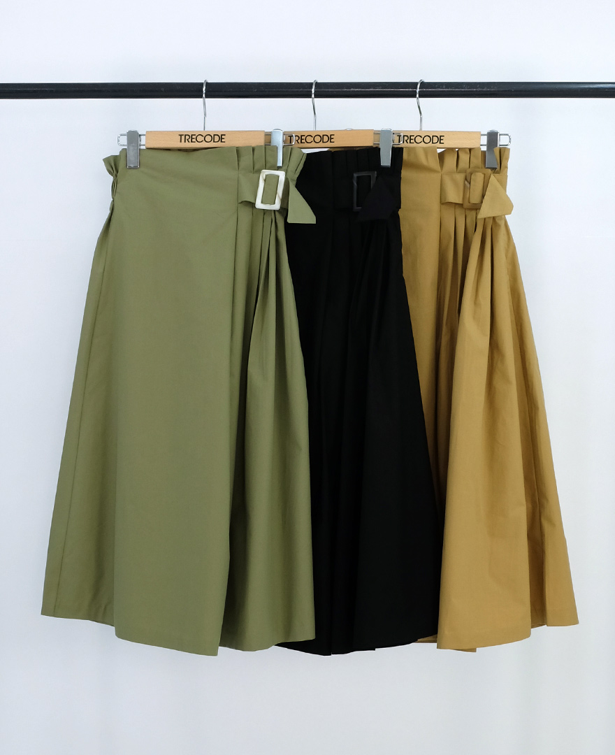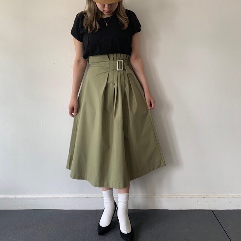 夏にも秋にも振れるポイントタックベルトロングスカートは、シンプルなトップスと合わせてデザインを強調。