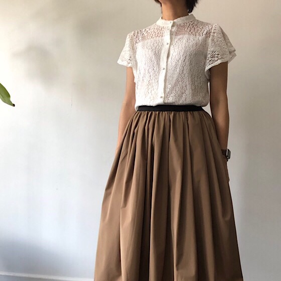 涼しげなレースでも、ボトムスをぬくもりのある色に変えると一気に秋っぽコーデに。