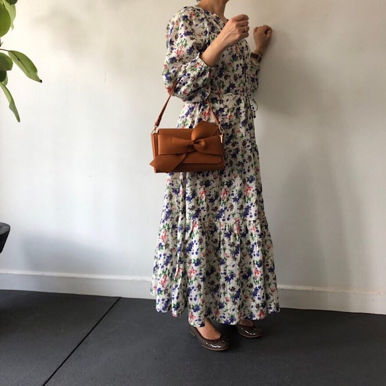 大きめの花柄は大人の女性でも挑戦しやすく、ワンピースでも甘くなり過ぎません。