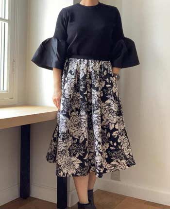 ボディはニットですがさらりとした素材感で、ベルスリーブになった部分に光沢があり、なんといっても華やかです。