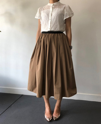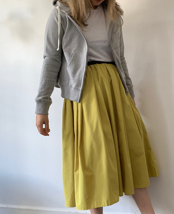 スカートに合わせて着ていますが、ドロストパンツやデニムなど、秋色のパンツとのコーデもかわいいですよ。