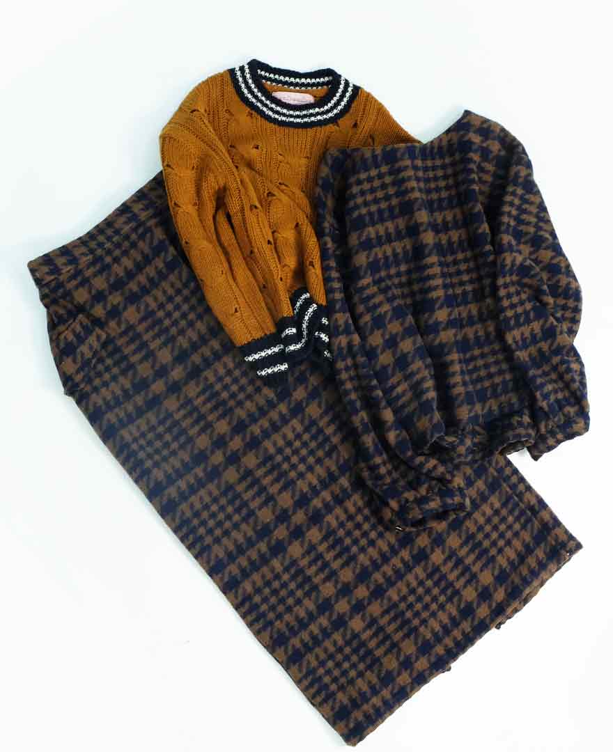 <ブラウンセット>は、ブラウンにネイビーの千鳥格子のセットアップに、