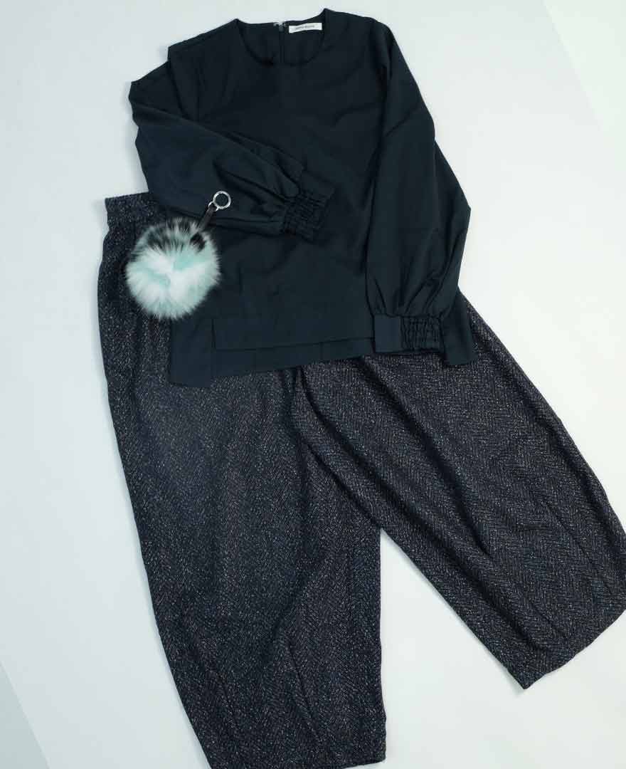 ブラックのボリューム袖ブラウスは、一枚あると改まった席にも使えて便利です。