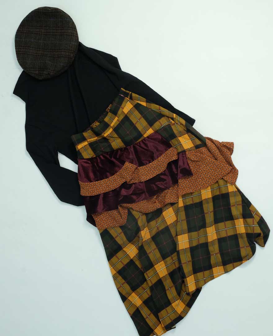 3.ベロアと柄の2段になったフリルが斜めにドッキングしたチェックスカートは、