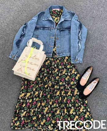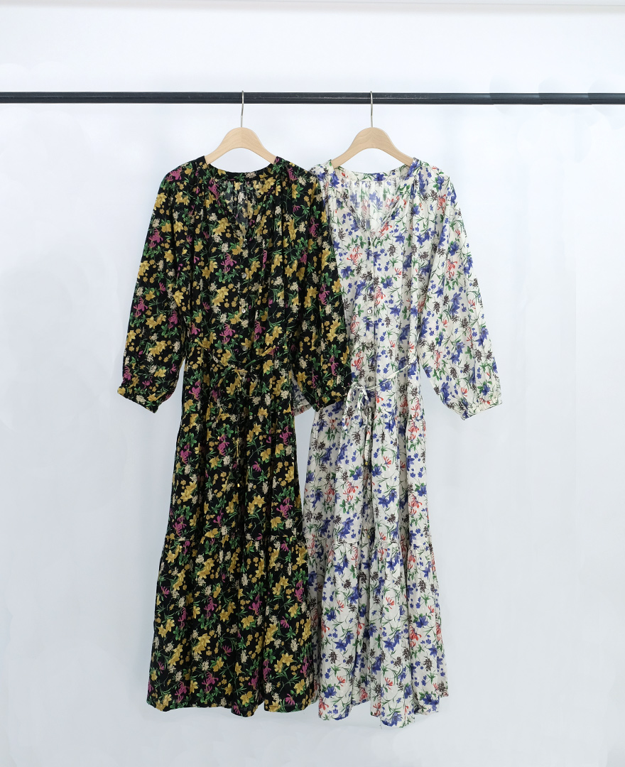 長袖のフラワーワンピは、デニムジャケットやざっくりニットを上からかぶっても可愛いプリント。