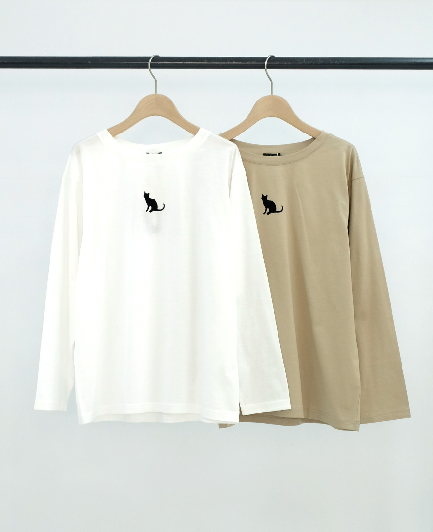 黒猫のフロッキープリントがアクセントのカットソーは、きれいめアイテムなので、一枚あると便利。