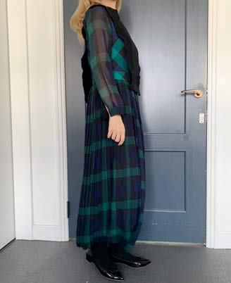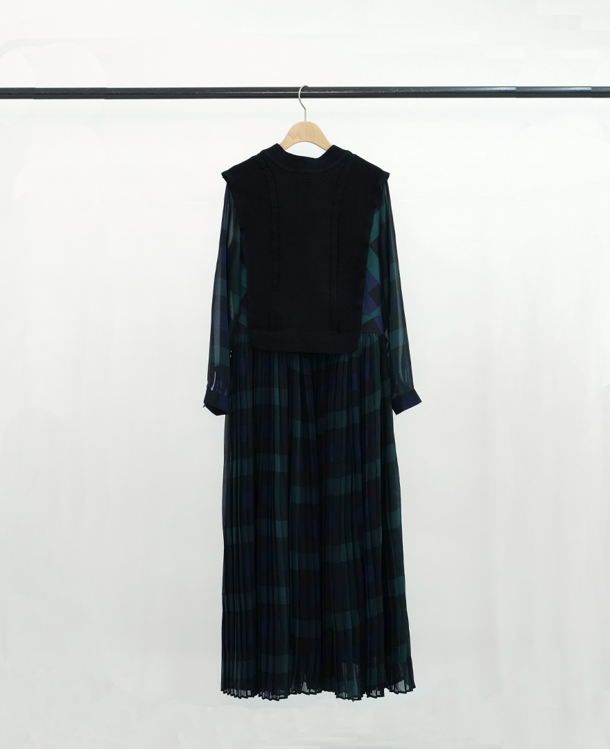 今季トレンドずばりのチェックプリントにベストをかぶったような合体タイプは、シースルーになった袖が、ガーリーな上品さの中に軽やかさとほのかな色香を感じさせるところが魅力。