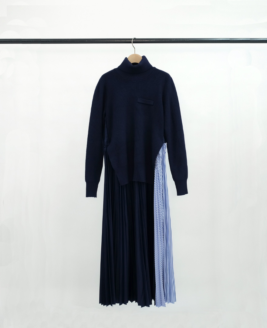 ニットとワンピを着たように見えるアイテムは、タートルネックが前身頃だけというオシャレ知能犯なデザイン。