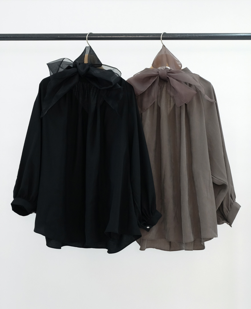 とろみ素材のマットな質感のブラウスは、ハイネックになっているので、リボンをオフにしてシンプルに着ても、タックが細かく取られた袖にボリュームがあるので華があります。