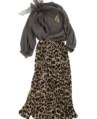 オーガンジーリボンハイネックブラウスに、レオパードプリーツロングスカートを。