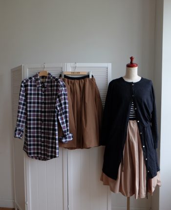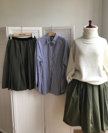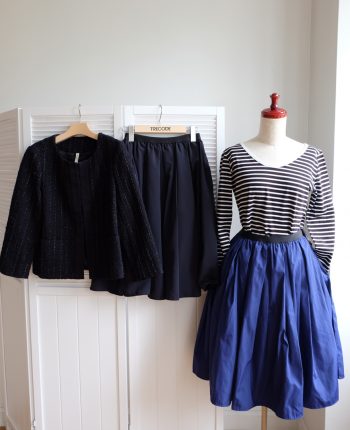トレコードの山の手スカートはどの長さも30色カラー展開があるのですが、今日はその中からカーキ、ネイビー、ベージュをピックアップしてみました。