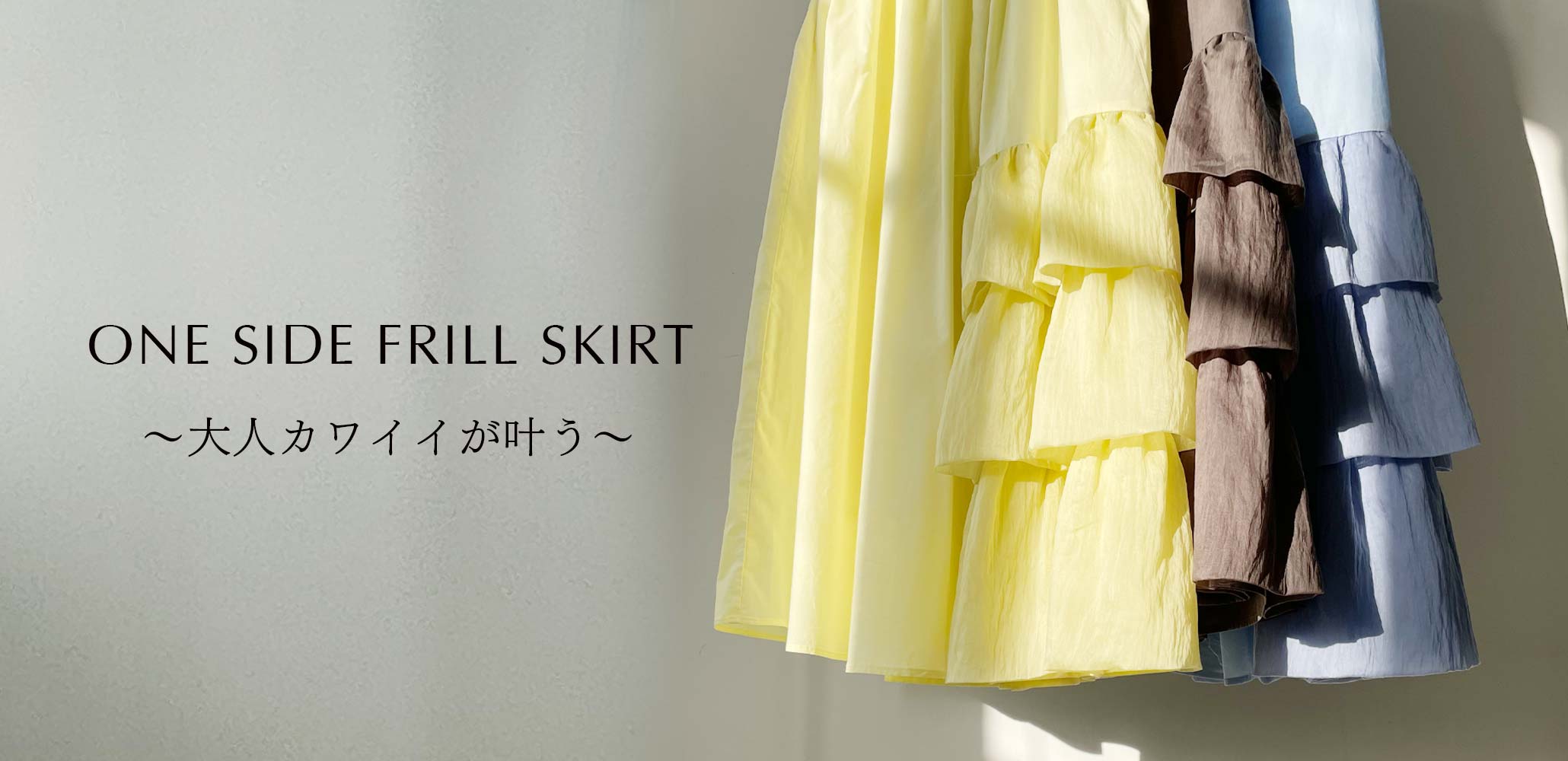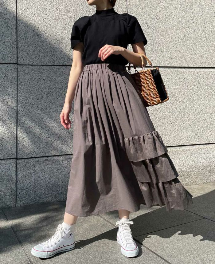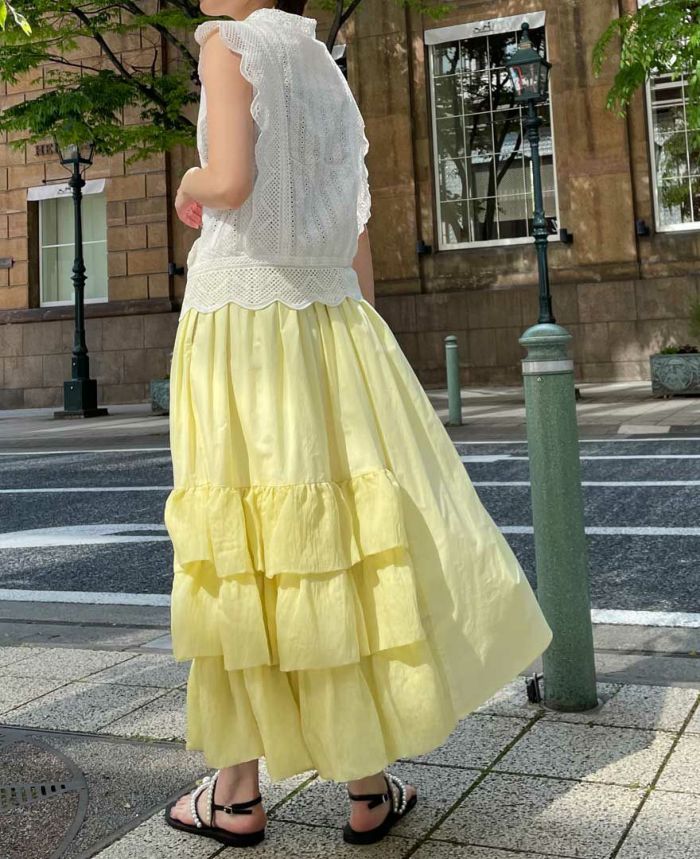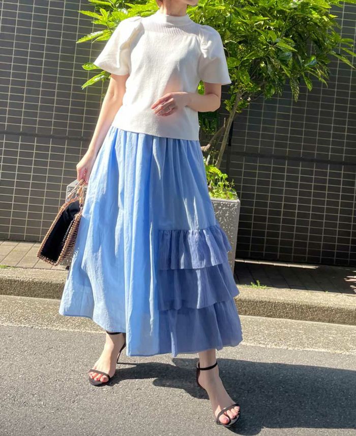 片側のみにあしらわれた3段フリルは前後で幅が異なり、見る角度によって表情が異なるスカートはついついくるっと回りたくなります♪