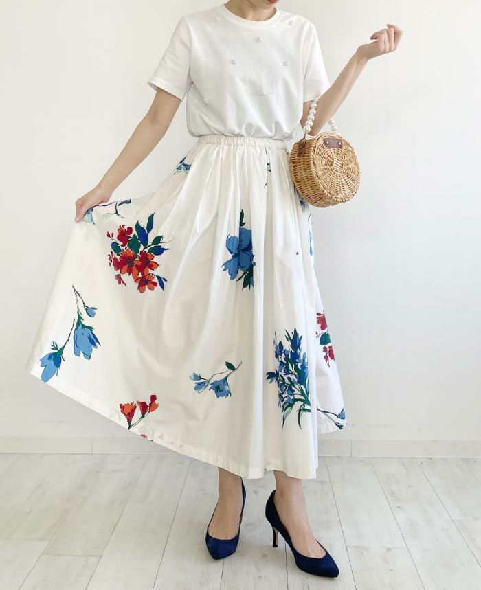 一枚でコーデが華やぐ花柄コットンスカートはシンプルトップスを合わせて海辺へお出かけしたくなりますよね♪