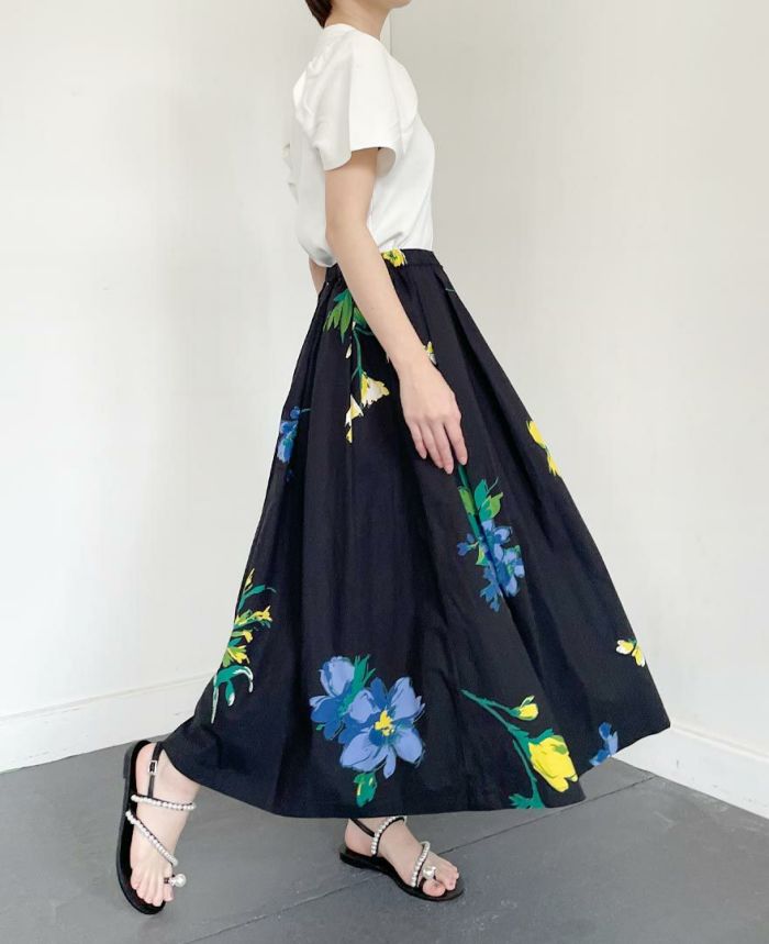 鮮やかな大きめ花柄がコーデに華やかさを演出してくれる”花柄コットンスカート”