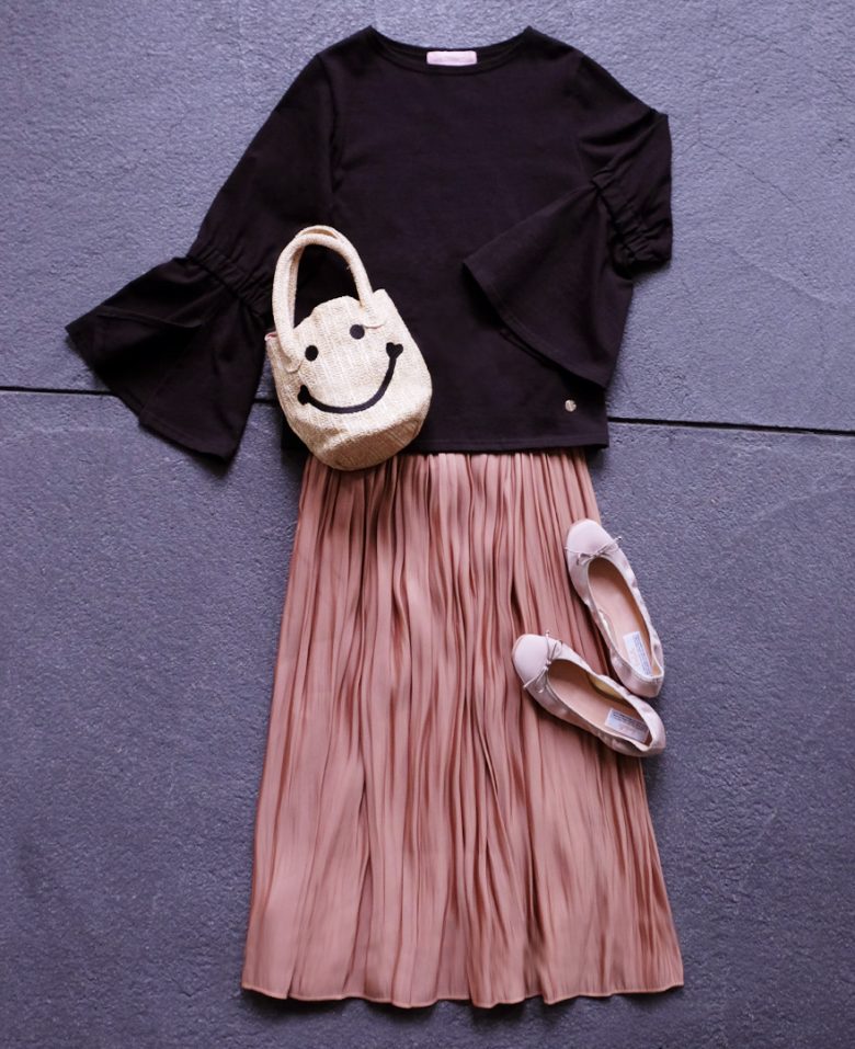 【ブラックのTシャツ×ゴールドのギャザースカート×ニコチャンバッグ×スクエアバレエ】