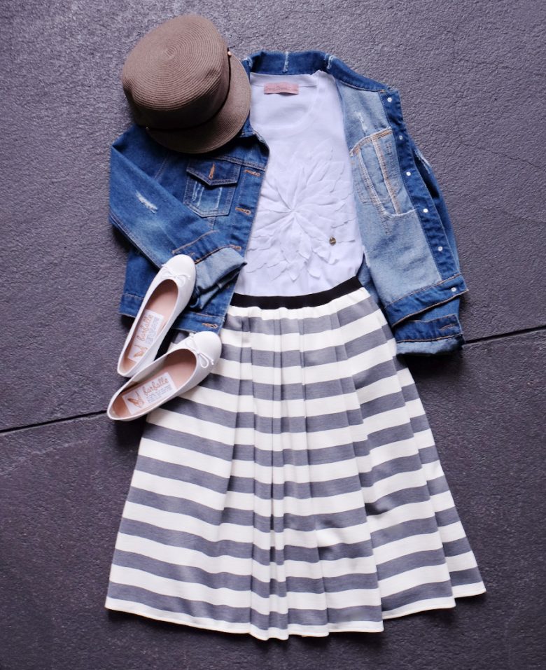 【デニムジャケット×お花Tシャツ×ボーダースカート×キャスケット×バレエシューズ】