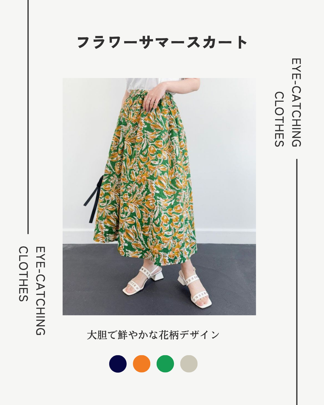 心躍る花柄デザインのスカート。ベーシックなトップスと合わせるだけでコーデが華やぎます。