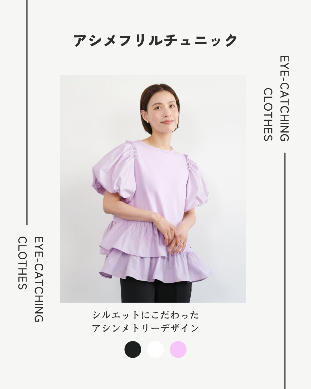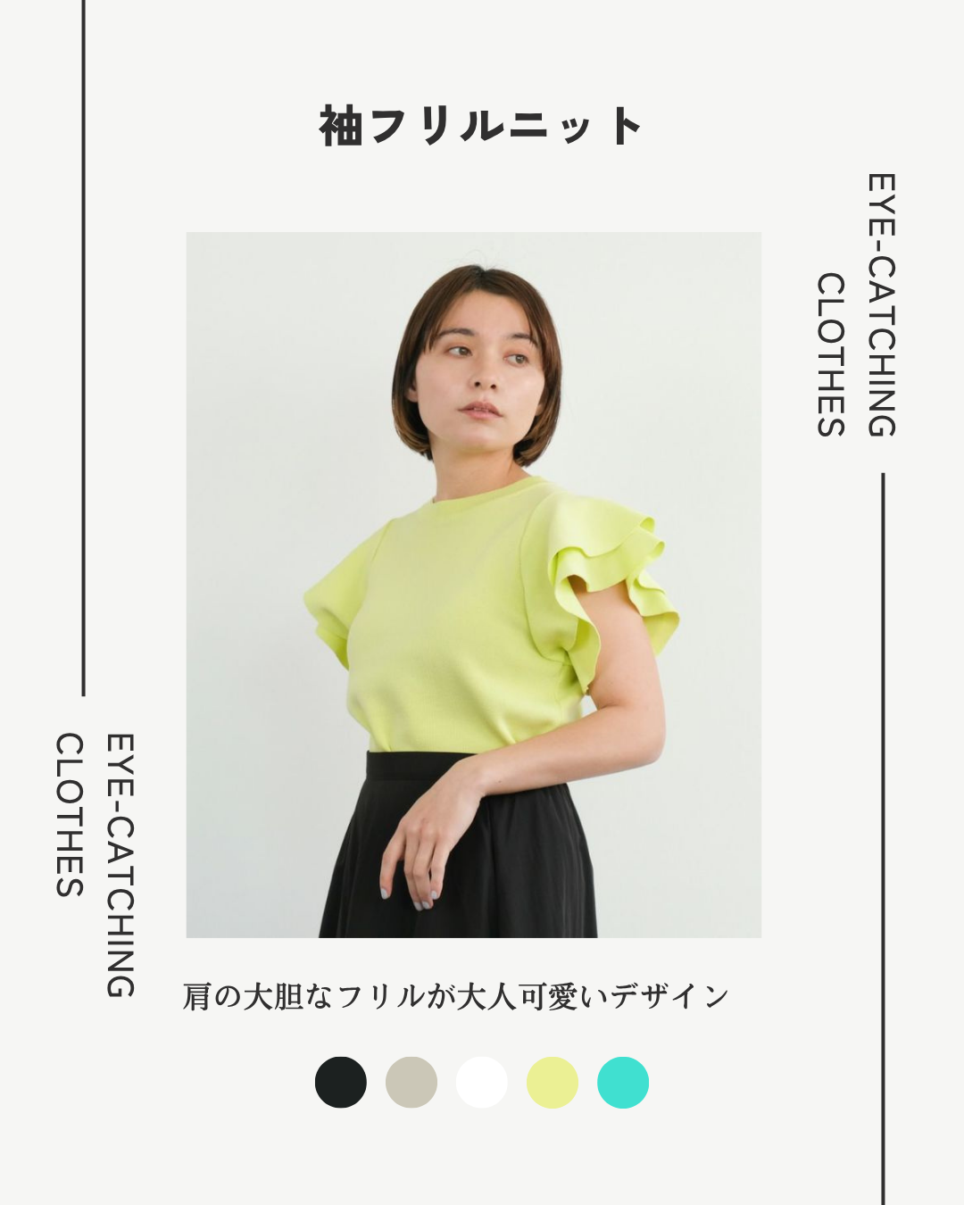 お袖の2重フリルが大人可愛いデザイン。肩のフリルが少し内側に入っているので細見え効果も。無地なので、ボトムスとの相性がよく着回しがきくのもポイントです。