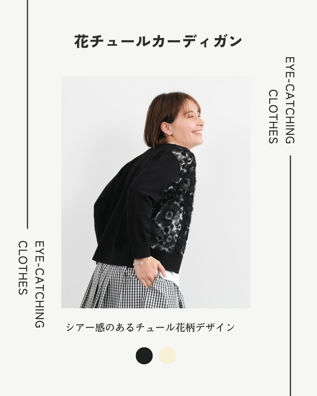 立体的なお花のデザインが目を引く1枚。チュール生地を使っていて、程よい透け感が上品。