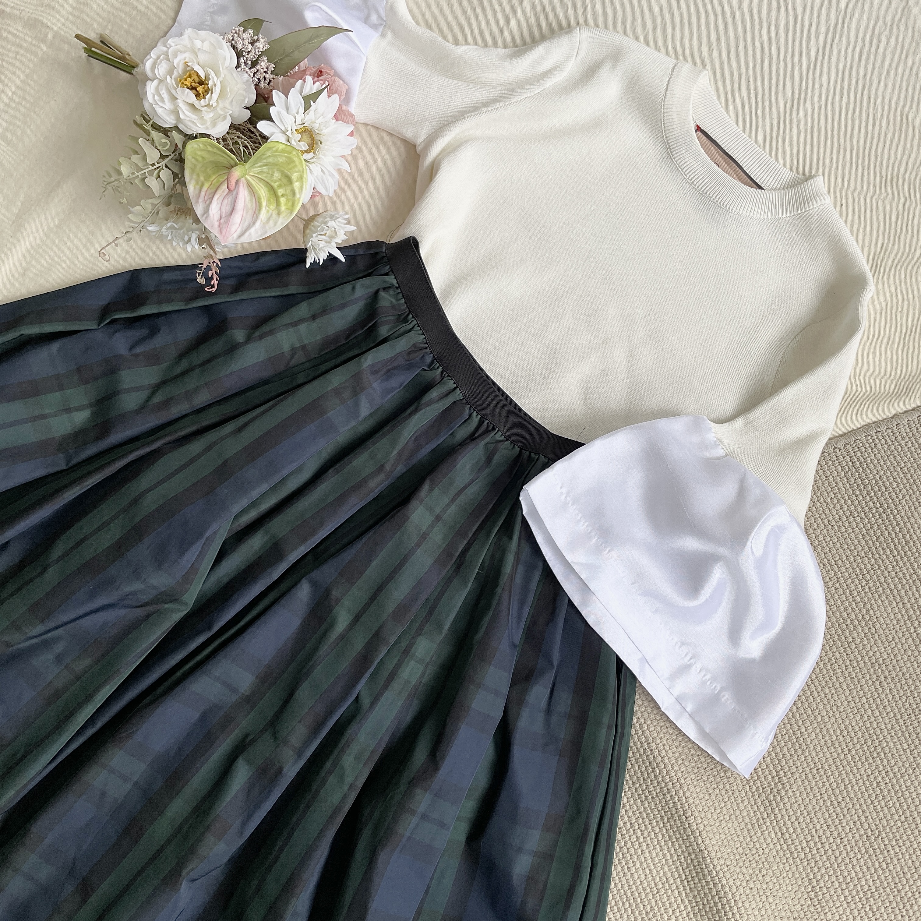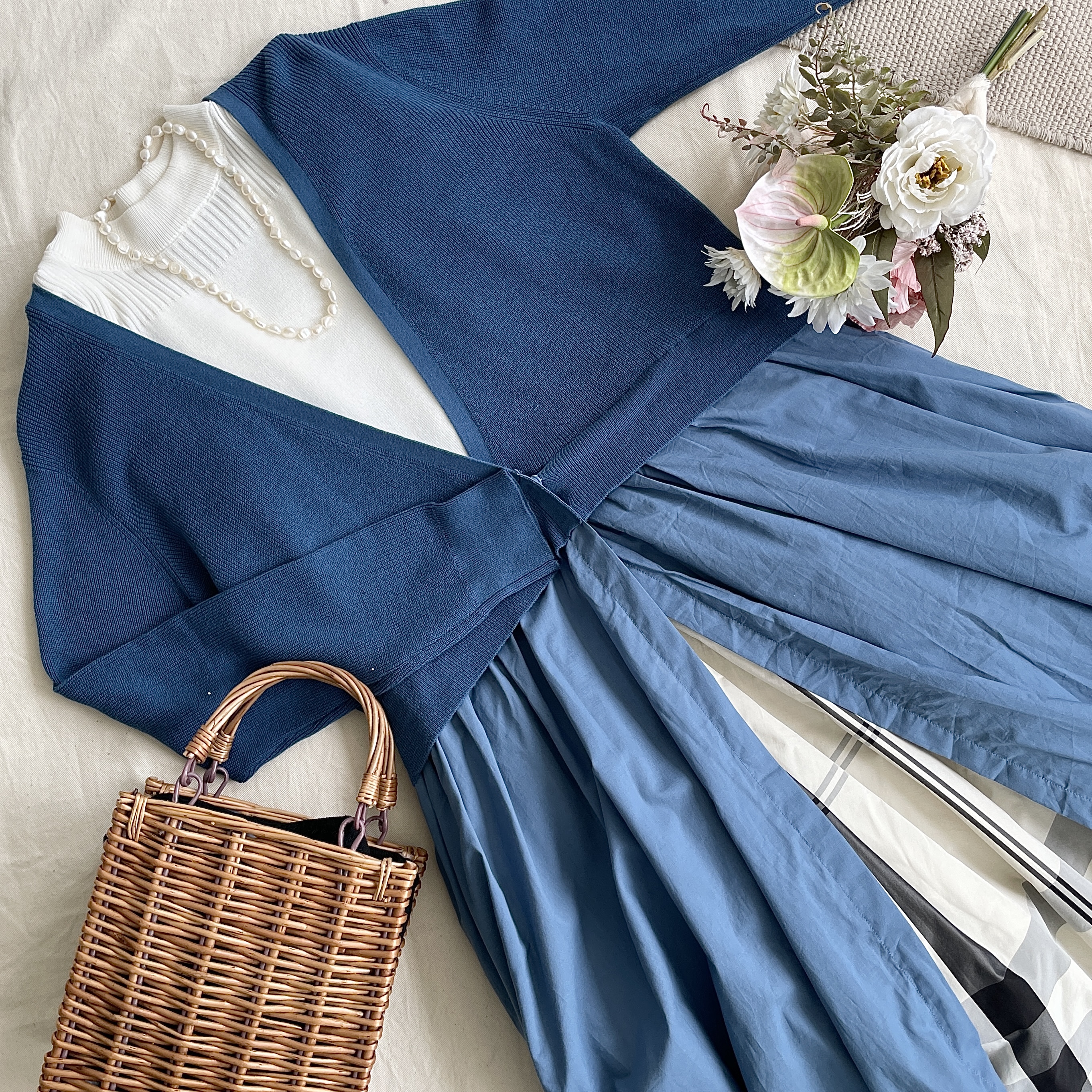 ニット地のカーデとコットンスカートがドッキングした、ワンピースにもロングカーディガンにもなる優秀アイテム。
