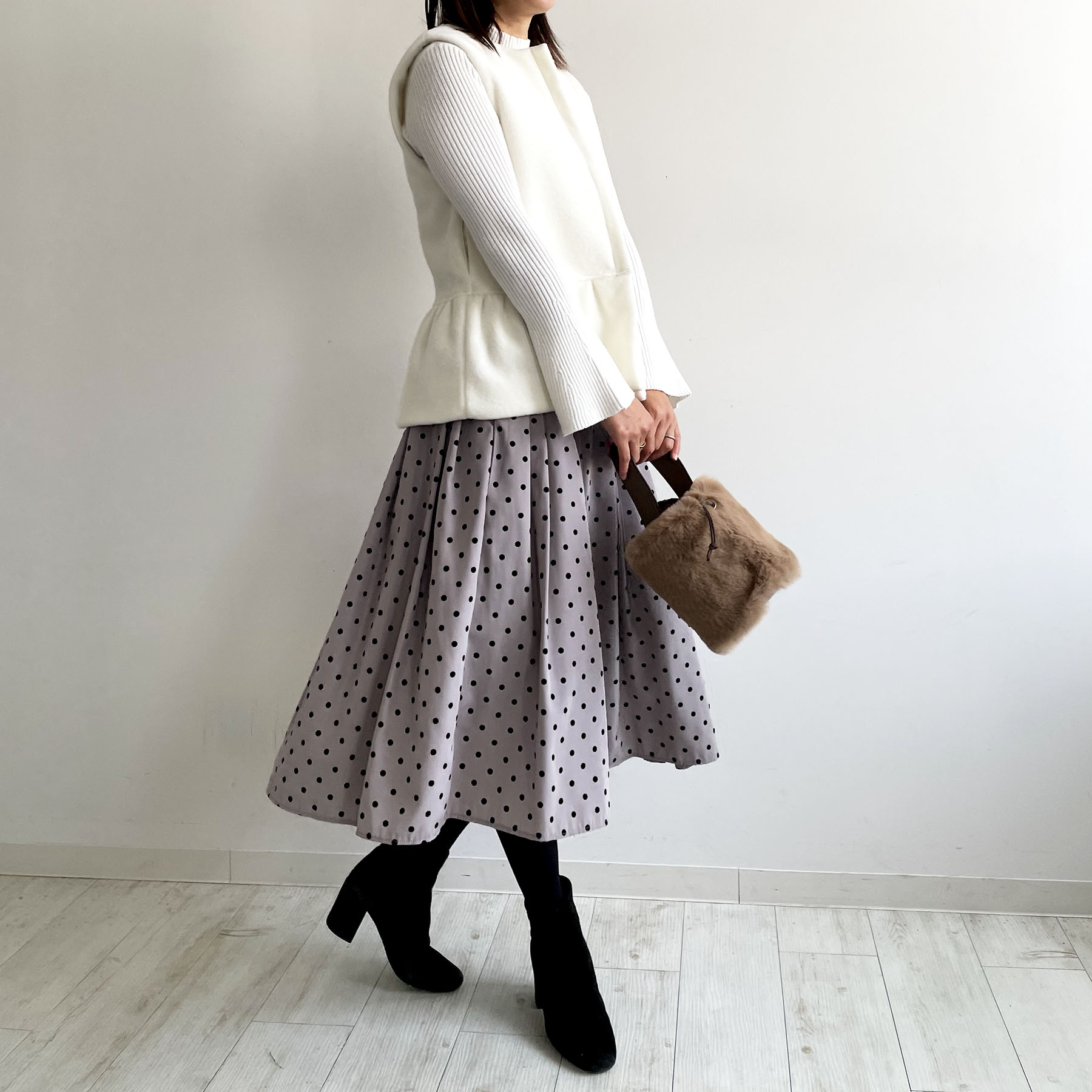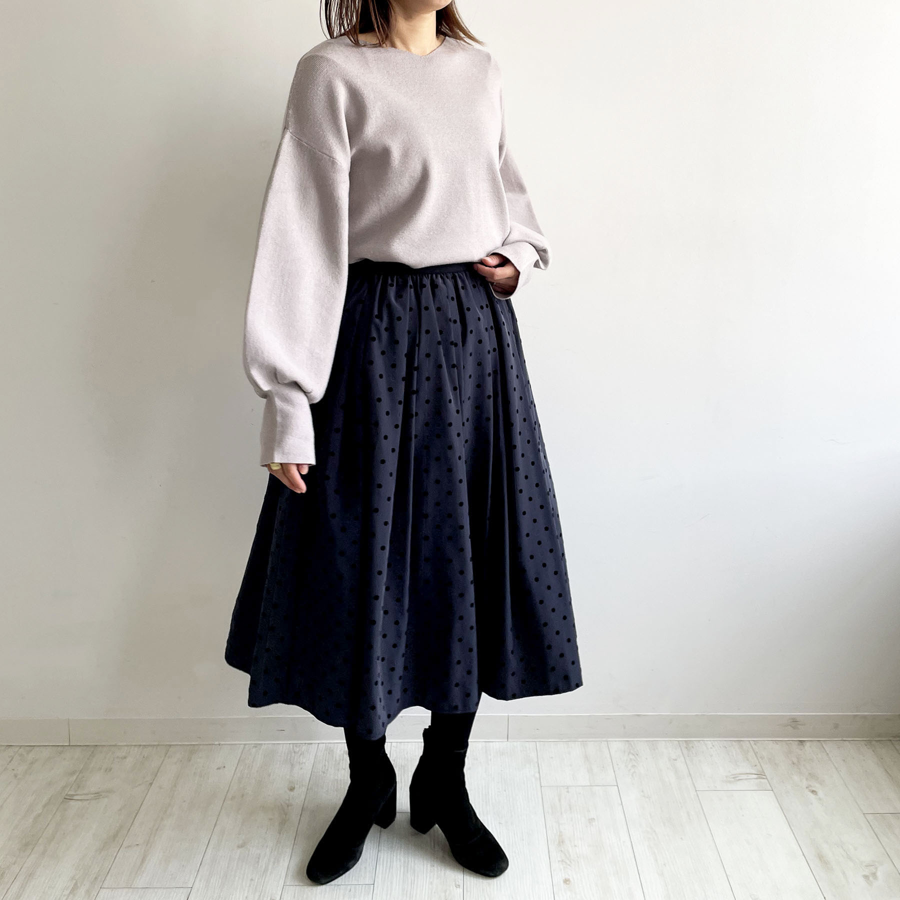 SKIRT:神戸・山の手フロッキードットスカート D.グレー/ミモレ丈