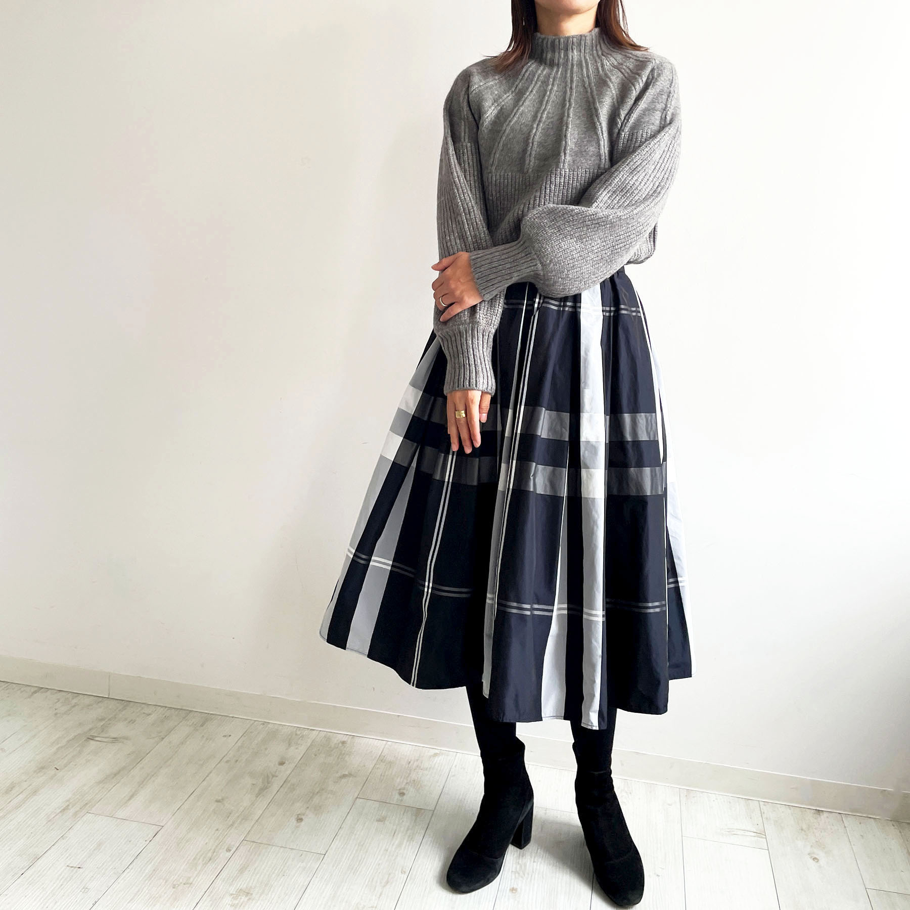 SKIRT:神戸・山の手モノトーンチェックスカート ネイビー/ミモレ丈