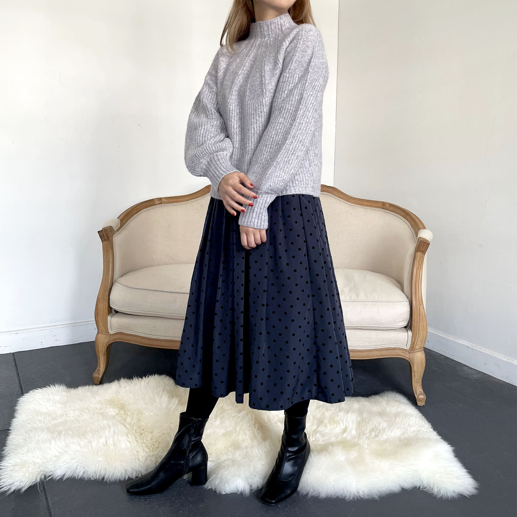 SKIRT:神戸・山の手フロッキードットスカート ダークグレー/ミモレ丈