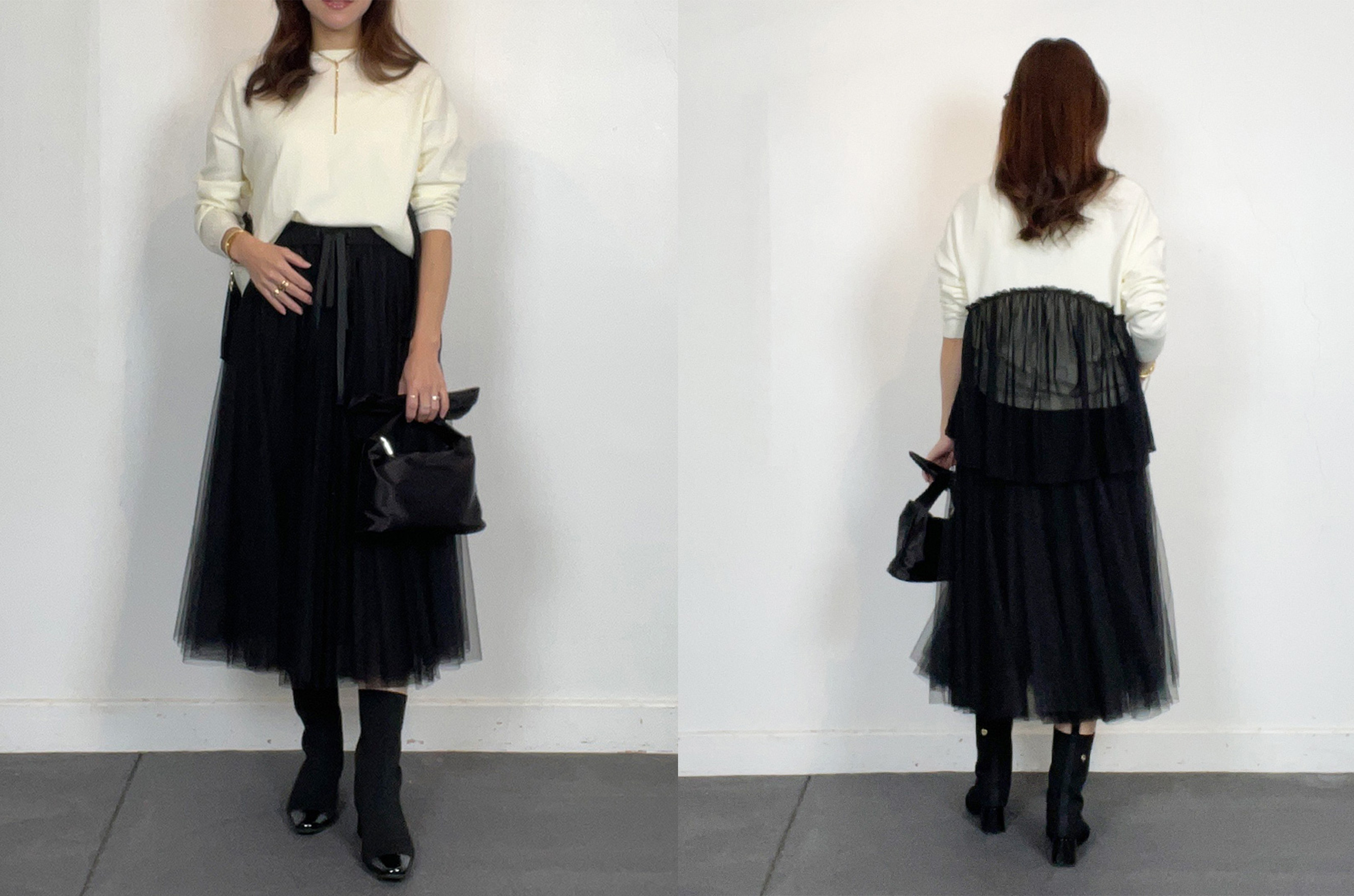 色物ではなく、チュールの素材感を使ってコーディネートに華やかさを出してみました。