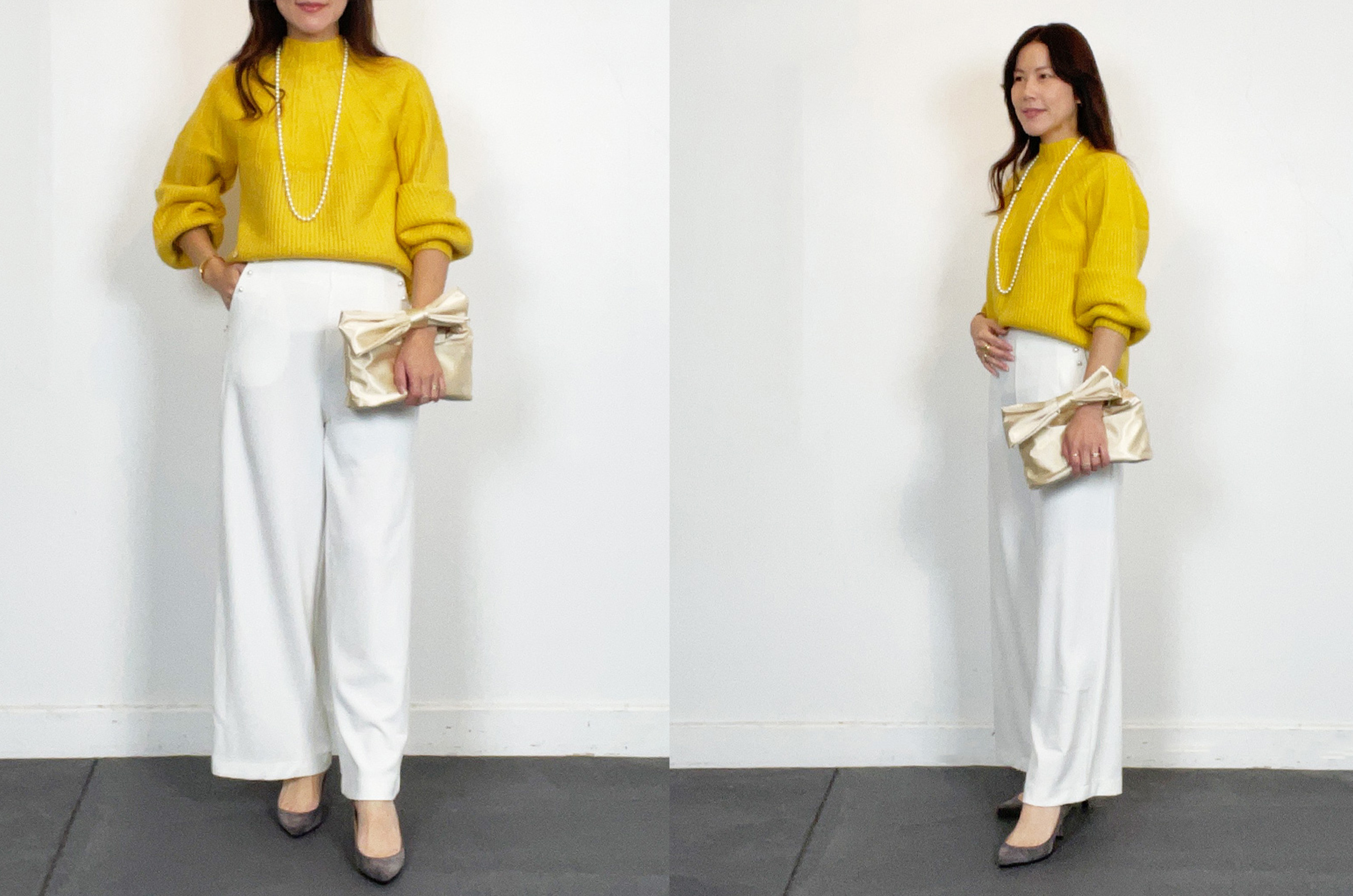 トロミのある生地感のパンツがエレガントさを出してくれニットのカジュアルさを打ち消してくれます。