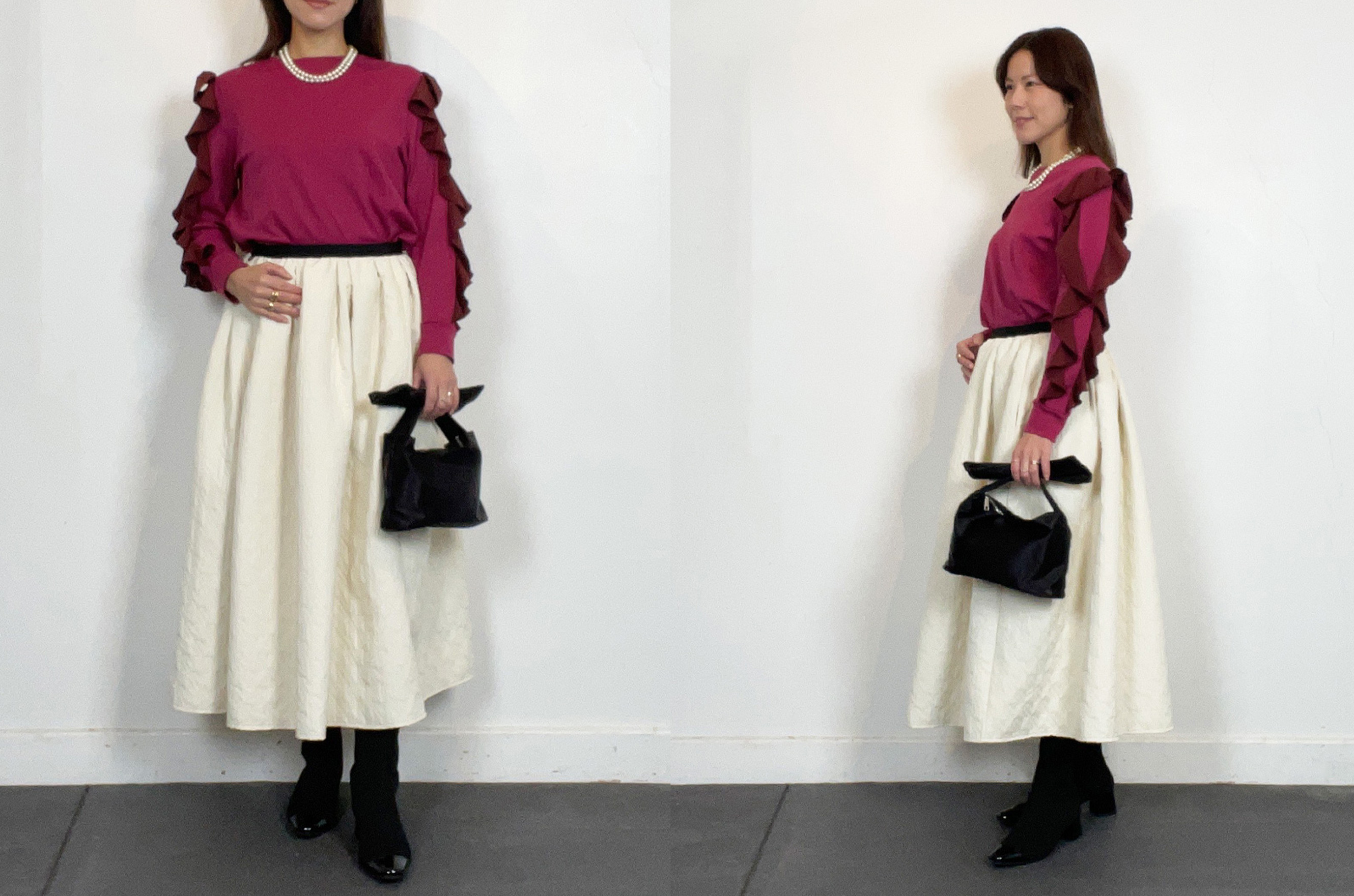 ピンクのスカートは色味に柔らかさがあり、女性らしいさと華やかさを演出してくれます。