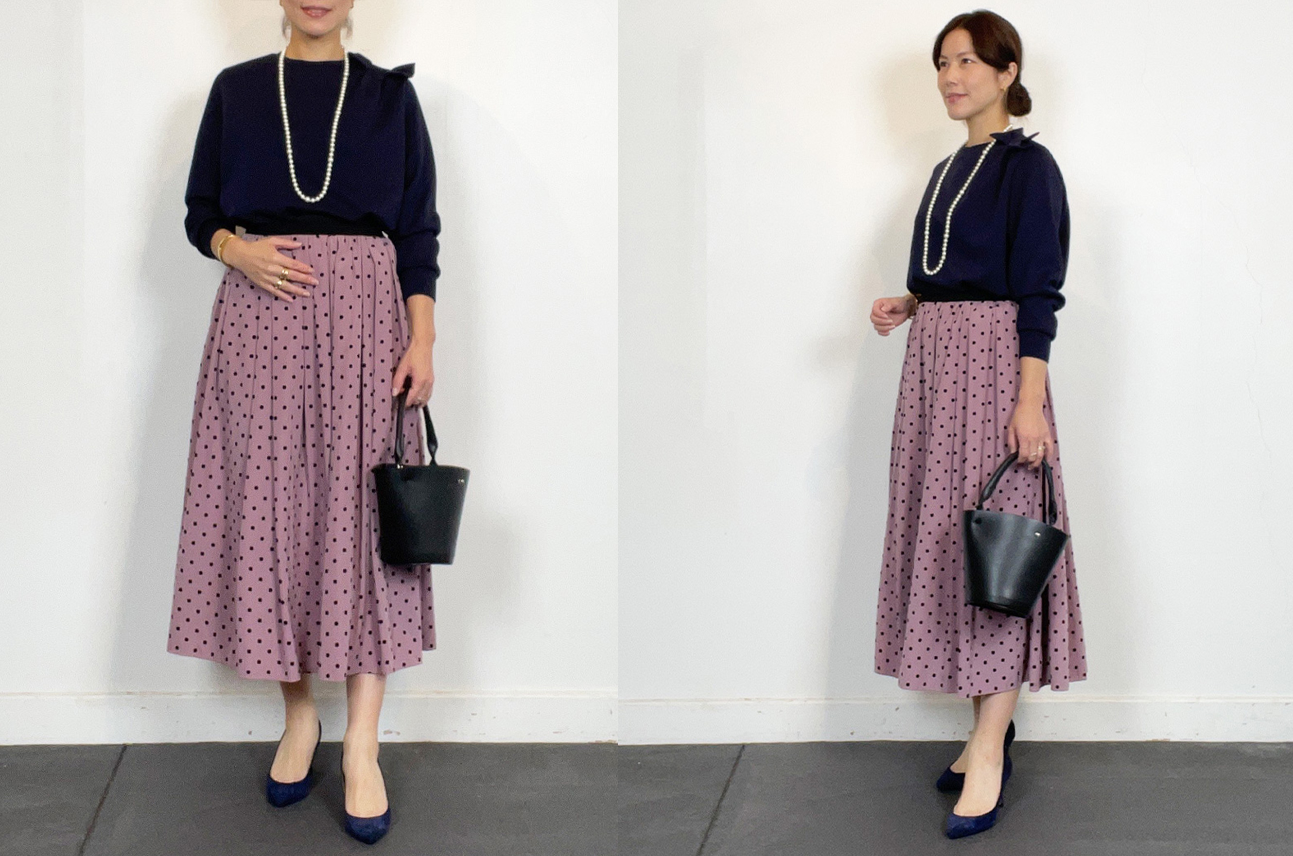 ネイビーのトップスでキチンと感を出しつつ、スカートのドット柄とピンクカラーで遊びを効かせたコーディネート