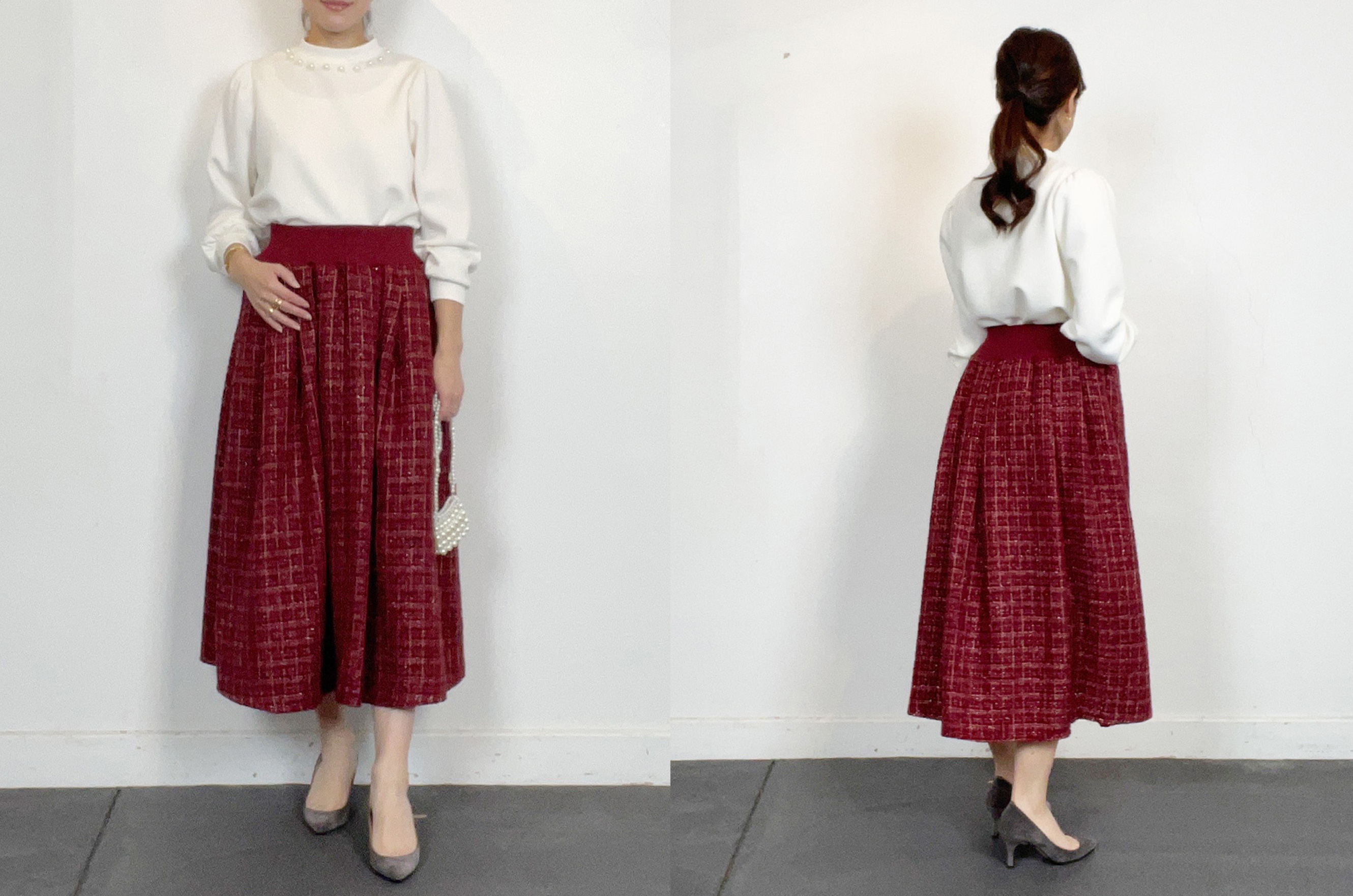 キラキラと光に反射して煌めくツイードスカートで1点で華やかにキマるコーディネート