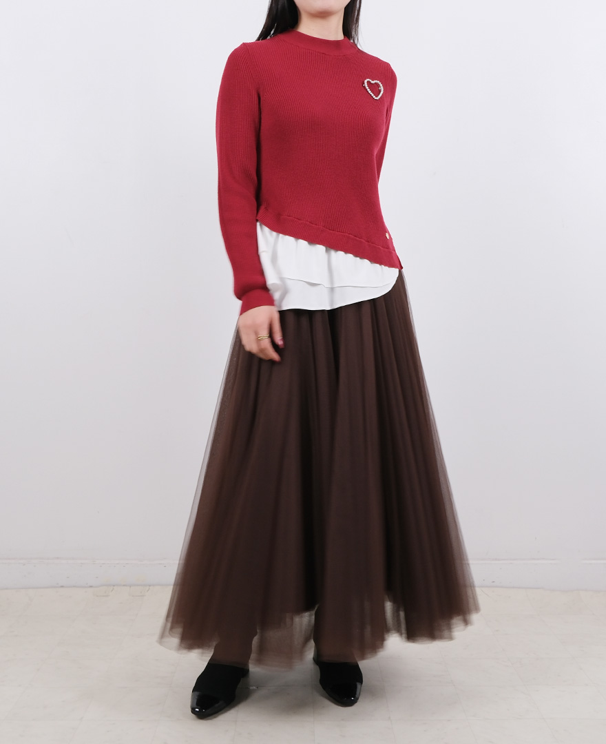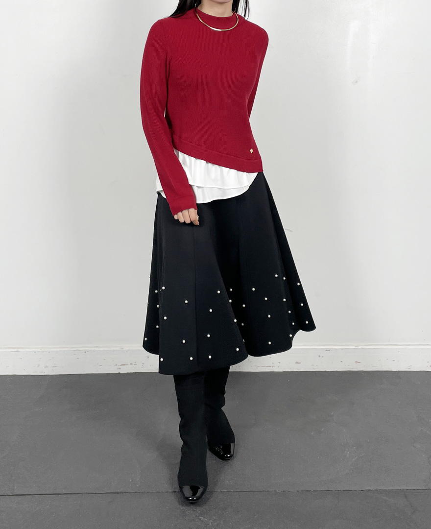 赤ニットの華やかさを活かしつつ、裾パールがあしらわれたブラックスカートで落ち着きをプラス。