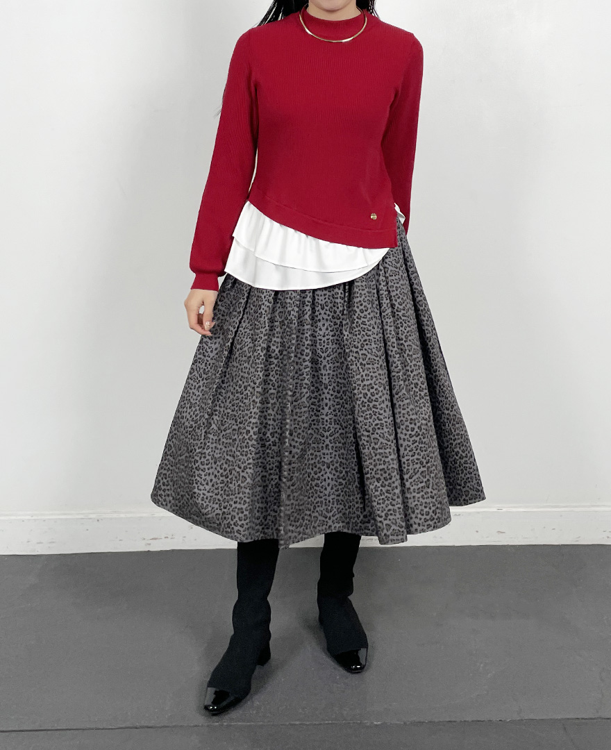 赤ニットの女性らしさに、グレーのレオパードスカートが程よくスパイスを加え、大人のこなれ感が演出できます。