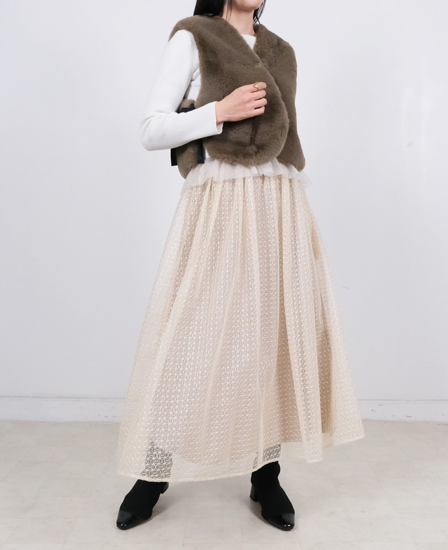 レースのフレアスカートと合わせることで、全体のトーンがまとまり、柔らかく優しいムードに。