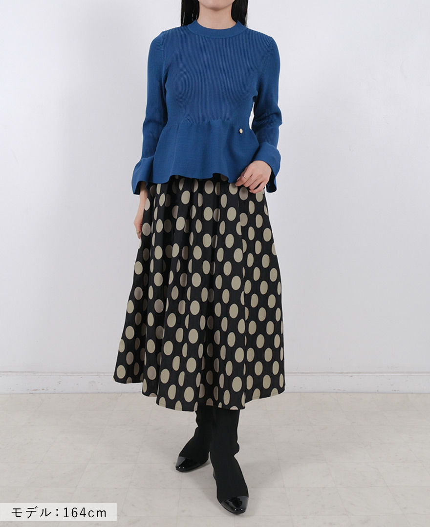 ブルーニットのすっきりしたリブ編み×ペプラムの甘さに、ドットの大胆さが加わることで、大人の可愛さとモード感が両立します。