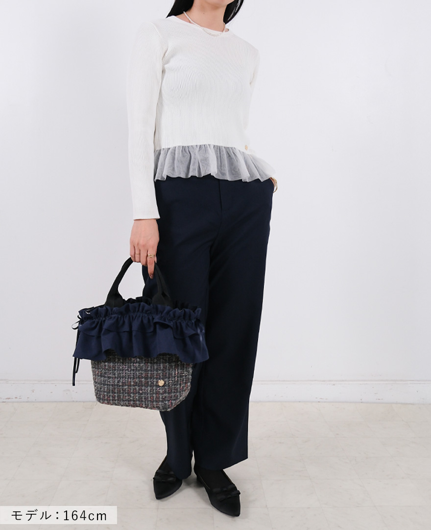 白ニットの清潔感と裾チュールのさりげない甘さに、ブラックのワイドパンツを合わせることで、自然と上品で凛とした印象に仕上がります。
