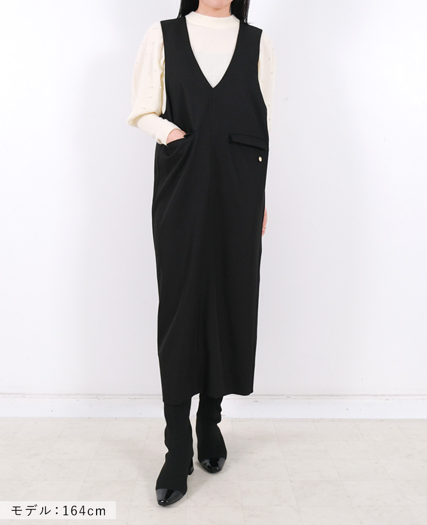 袖パールニットが主役になるよう、ジャンパースカートはブラックで引き締めて上品な印象に。