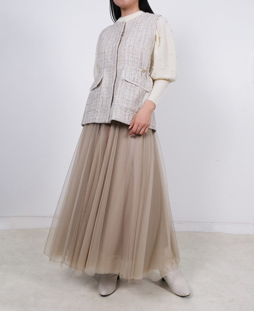白系ツイードジレはフォーマルすぎず、でもしっかり高見えするので、“きちんと・華やか”の絶妙バランスに。
