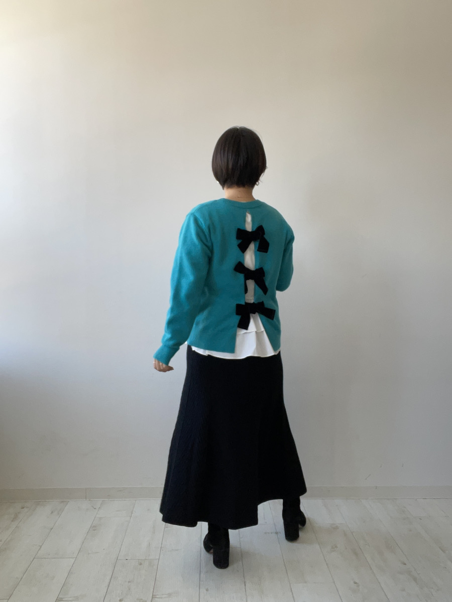 太めのベロアリボンが3つついているバックスタイルが可愛いニット。