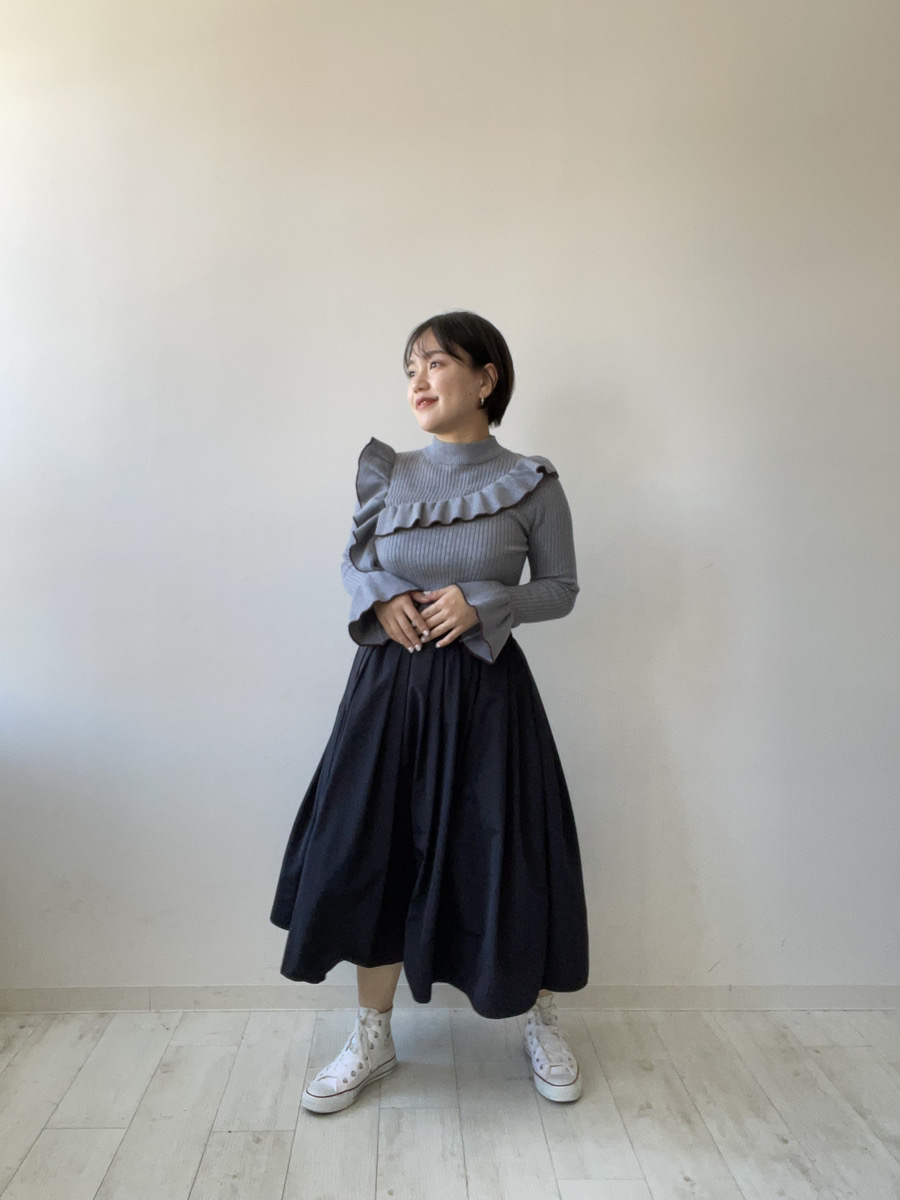 たっぷりと生地を使用したフリルニットはどこかクラシカルな印象も与えてくれます。
