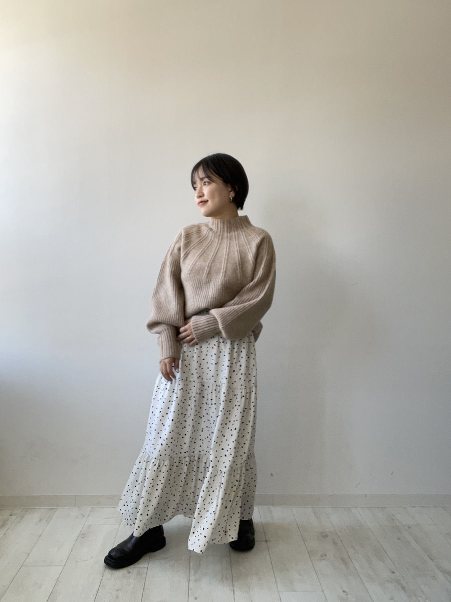 程よく厚みのあるニットにとろみのあるティアードスカートを合わせてゆったり休日コーデに。
