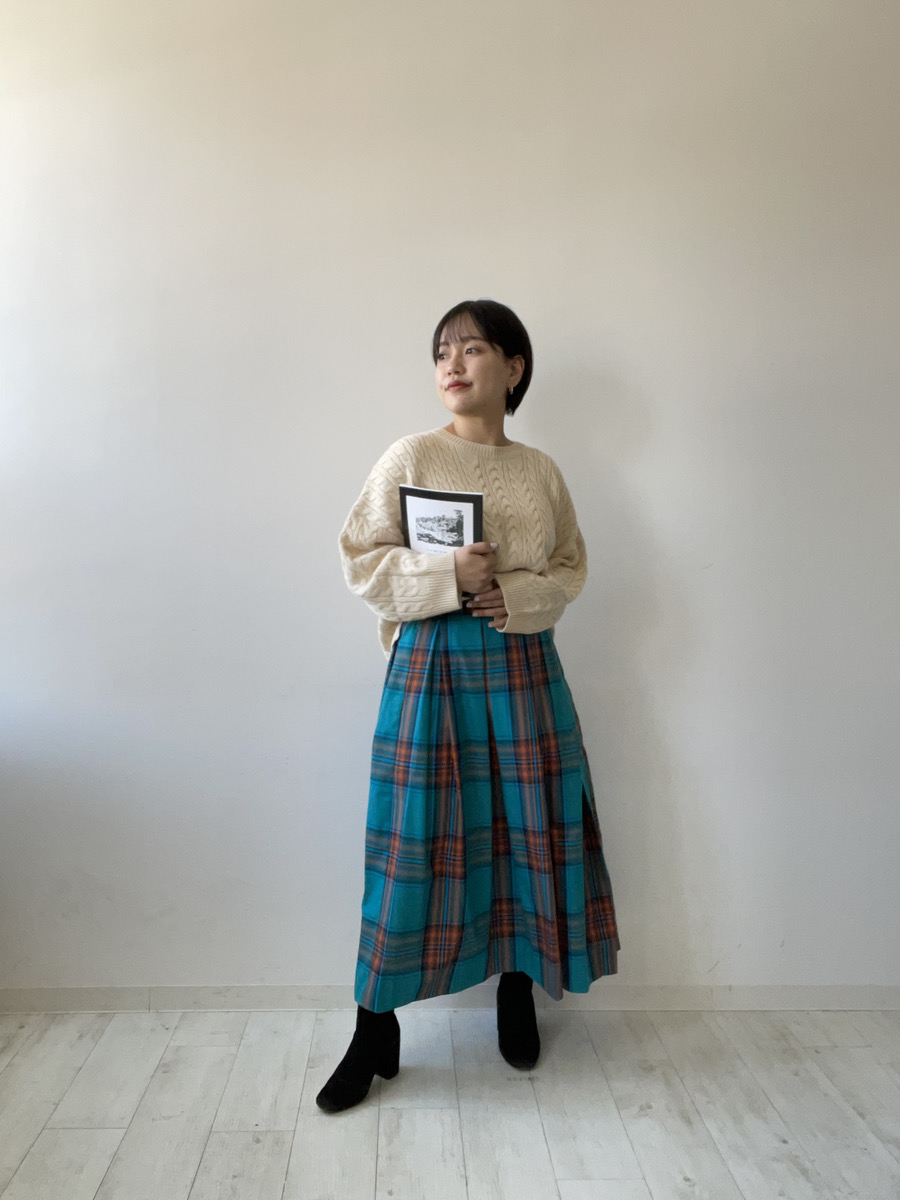 ケーブル編みに負けないビビッドな配色のチェック柄スカートを合わせるとバランスGOOD◎