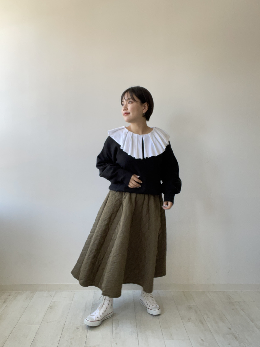 カジュアルな雰囲気のキルティングスカートもどこかこなれ感のある印象に様変わり。