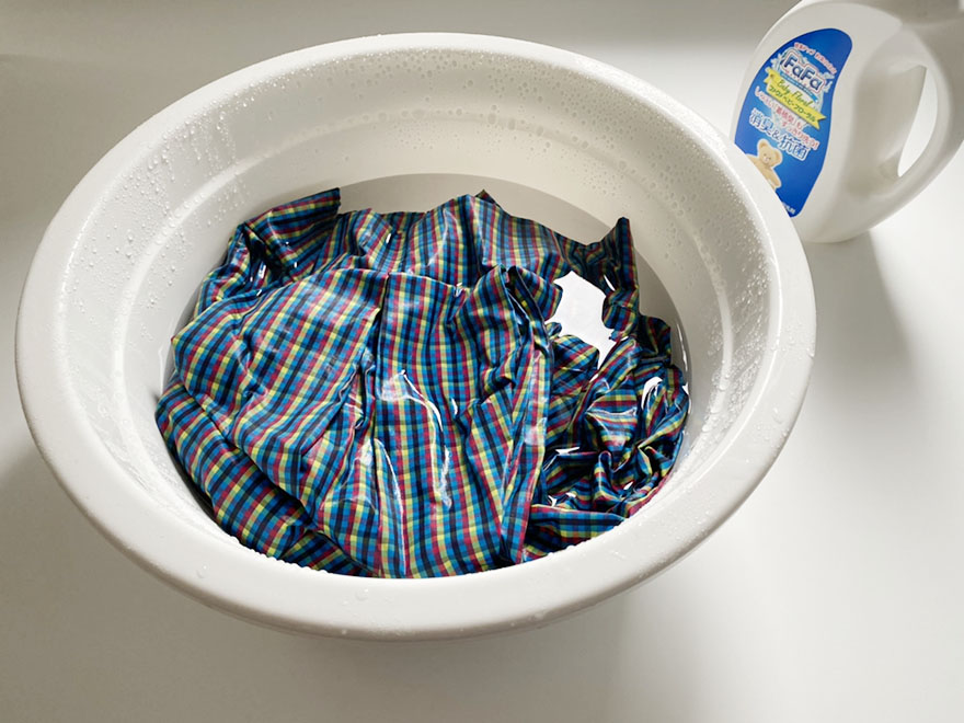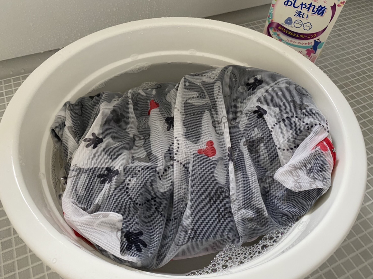 裏返してネットに入れ、おしゃれ着用洗剤で優しく押し洗いします。