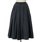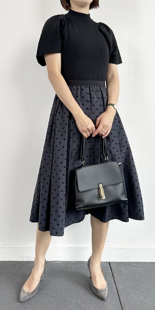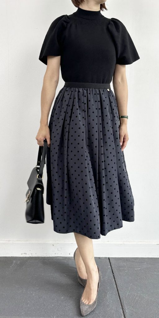 フロッキードット柄スカートも、シックなカラーを選べば、オフィスにも◎