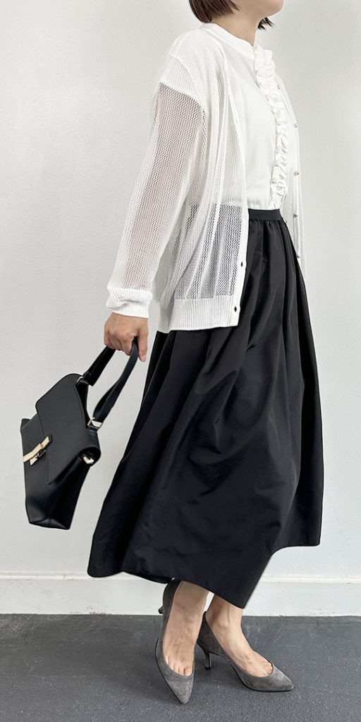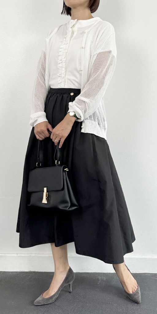メッシュカーディガンで、冷房対策もばっちりなモノトーンコーデ。