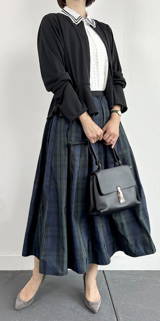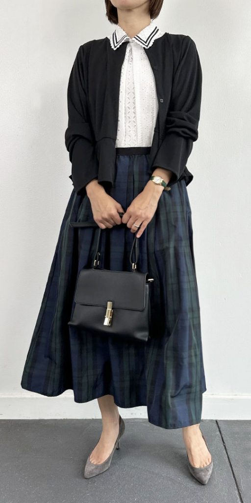 タータンチェック柄のスカート合わせで、知的で落ち着きのある大人女子にピッタリのスタイルです。