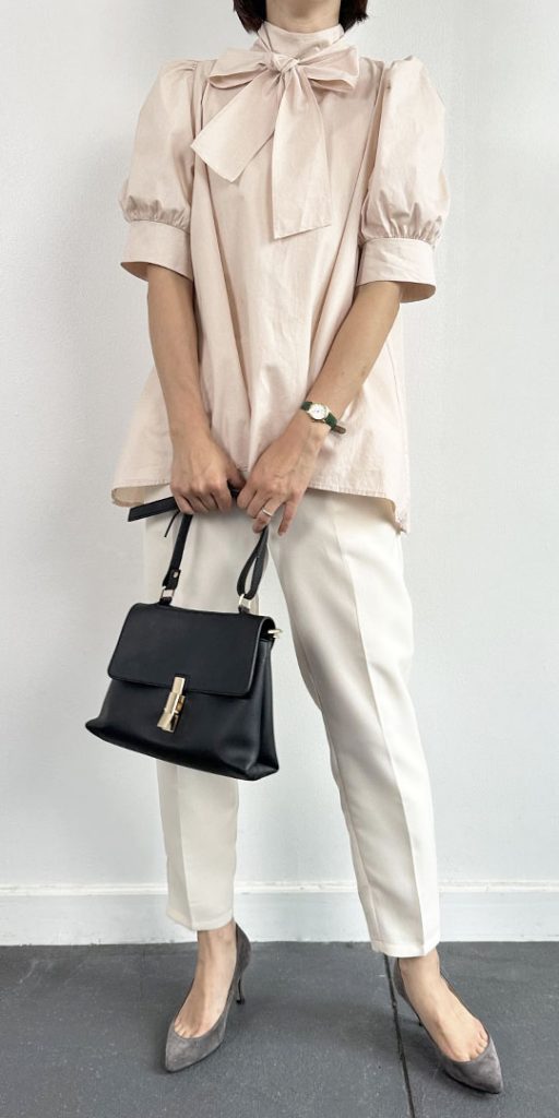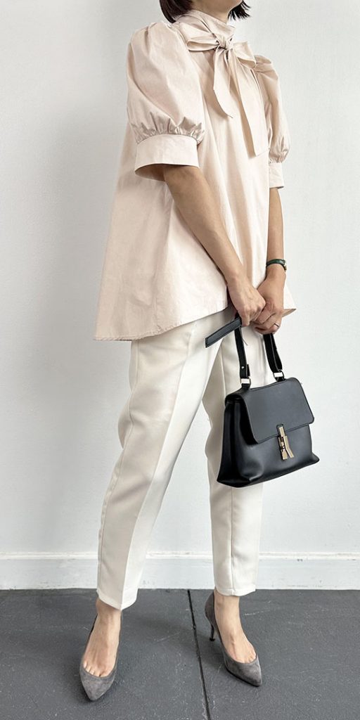 パンツもアイボリーカラーを合わせて、程よい甘さのオフィススタイルの完成♡