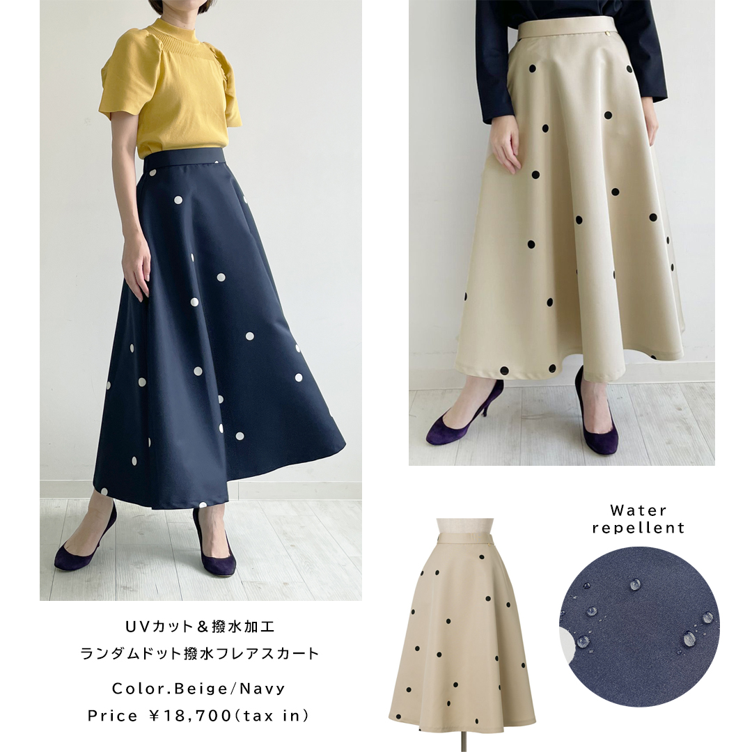 ふんわりと広がるシルエットがドラマティックな印象のドット柄スカート。